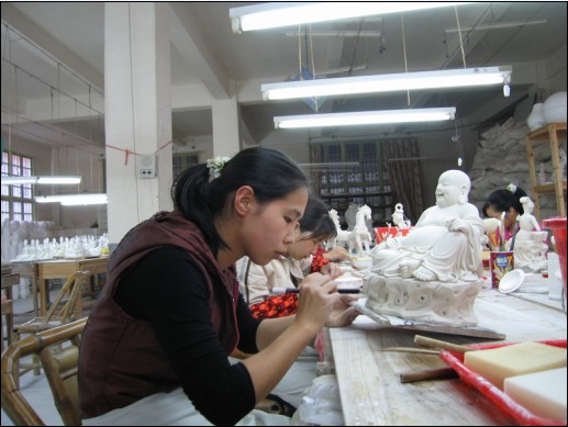 德化陶瓷制作生产始于新石器时代,兴于唐、宋,盛于明、清,发展于当代。德化瓷雕塑始于宋代至今从未间断,形成独具特色的传统工艺,一种是选用优质的高岭土直接塑造成型,一种是将泥塑翻制模具后再注浆或拓印成型,干后根据需要决定是否上釉,而后放入窑中在一千多度的高温烧制而成的。